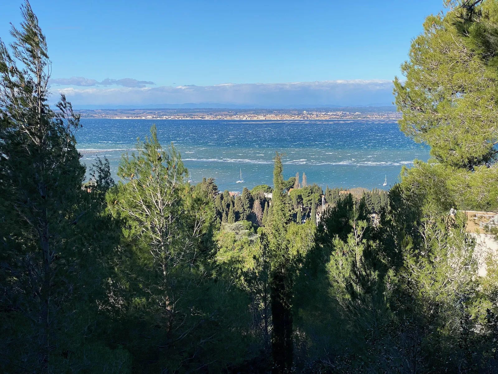 Nous redescendons vers le promontoire des Pierres blanches, que nous abordons par le haut de la pinède nord, jetons un dernier regard à l’étang, avant de revenir dans le soleil méditerranéen. Nous furetons entre les villas étagées, chacune s’offrant une vue imprenable sur le cordon littoral et le Canigou enneigé lévitant vers le large au fronton de la chaîne des Pyrénées.